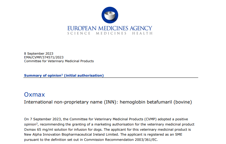 創(chuàng)新藥Oxmax是香港新意康公司血紅蛋白產(chǎn)品,用于重度失血性休克的急救,香港新意康公司經(jīng)過(guò)10年研發(fā)歷程, 終在2023年9月7日獲得歐盟、英國(guó)的上市許可。